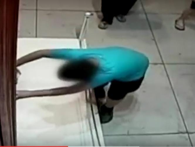 Footage released by the organisers of the Face of Leonardo: Images of a Genius exhibition in Taipei shows the boy - in shorts, trainers, a blue Puma T-shirt and holding a drink - walk past the still life, catching his foot and stumbling over.
