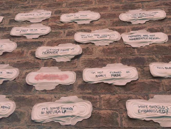 This work echoes a demonstration by students at Dehli's Jamia Millia Islamia University in India who last year covered the establishment with sanitary towels to protest discrimination and sexual violence against women.