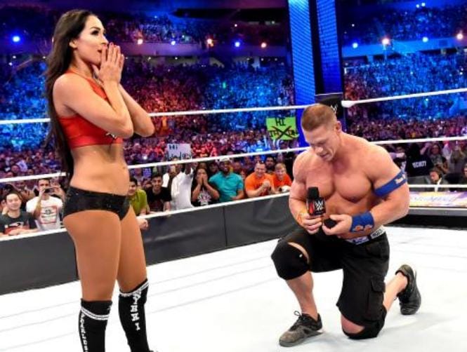 After the duo defeated The Miz & Maryse, Cena grabbed a microphone, took a knee and asked Nikki Bella to come to the center of the ring.