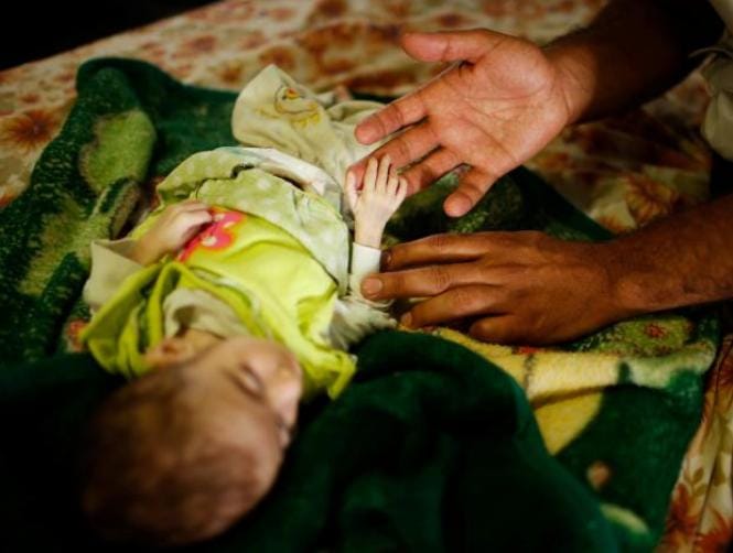 The babies cry with hunger but are so severely malnourished that doctors treating them at a hospital in Iraq would make their condition worse if they fed them enough to stop the pangs.