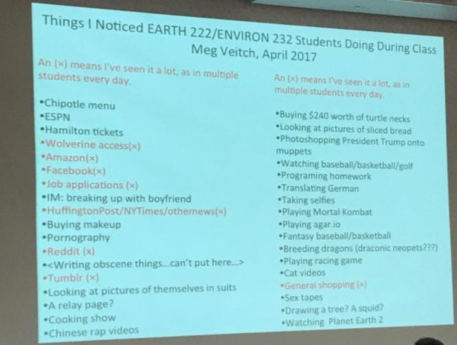 Entitled "Things I Noticed EARTH 222/ENVIRON 232 Students Doing During Class", the disgruntled academic used a Powerpoint slide to demonstrate that his charges were not paying attention during the Earth 222 lectures.