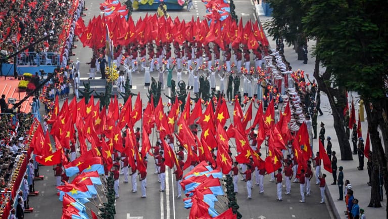 Celebrations culminated in a grand parade in Ho Chi Minh City with thousands of marching troops and an air show featuring Russian-made fighter jets and helicopters, as Vietnamese waved red flags and sang patriotic songs.