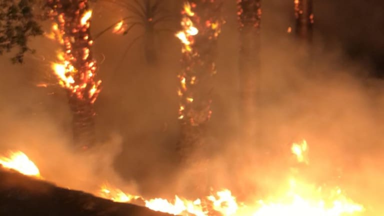 A massive fire broke out on the Nile Corniche in Cairo, Egypt, with flames engulfing trees and palm trees.