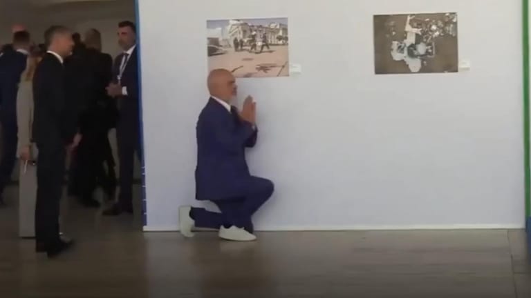 For the second time, Albanian Prime Minister Edi Rama kneels in greeting to Italian Prime Minister Giorgia Meloni during a conference on Ukraine.