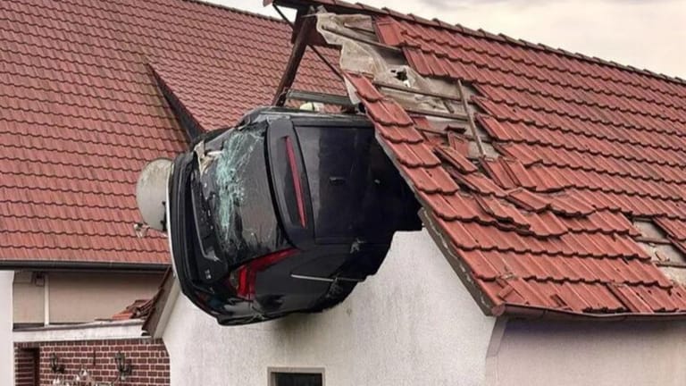 The town of Bohmte in southwestern Germany witnessed a horrific accident when a car veered off course, crashed through a garden, and became airborne before landing on the roof of a shed.
