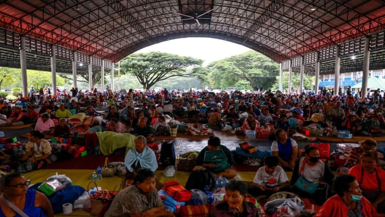 In the Thai border province of Sisaket, a university compound has been converted into temporary accommodation, where a volunteer said more than 5,000 people were staying.