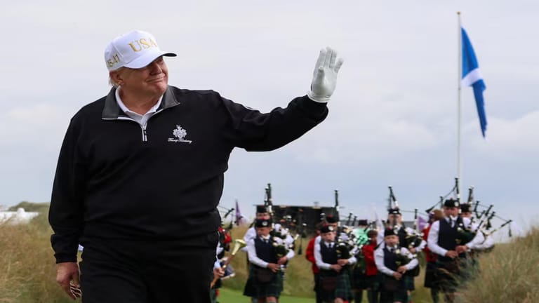 Trump, wrapping up a five-day visit to Scotland, was joined by former soccer players, golfers and business leaders for a first round of golf at his new second 18-hole course at Trump International near Aberdeen, Scotland.