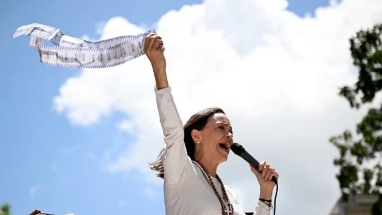 Machado, 58, has been subject to a decade-long travel ban imposed by Venezuelan authorities and has been in hiding for more than a year. Her whereabouts were not immediately known.