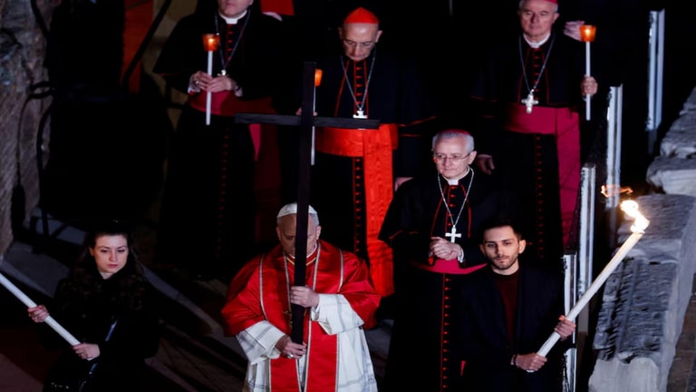 The pope, who has emerged as an outspoken critic of the Iran war, listened as an evocative set of spiritual meditations was read aloud inside the ancient amphitheatre to observe Good Friday, the day Christians mark Jesus' death by crucifixion.