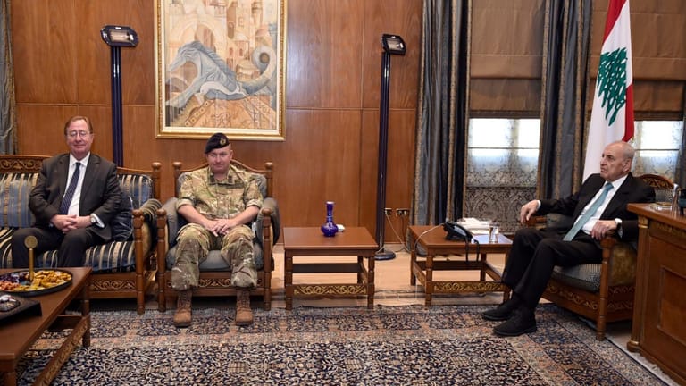 Parliament Speaker Nabih Berri received at the second presidency headquarters in Ain El Tineh, the UK Defence Senior Advisor to the Middle East and North Africa (DSAME) Vice Admiral Edward Ahlgren, and the accompanying military delegation, in the presence of British Ambassador to Lebanon, Hamish Cowell.