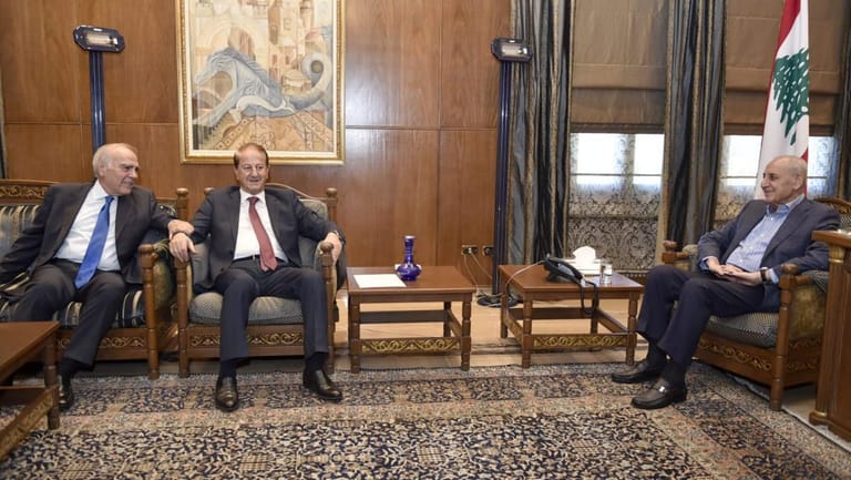 Parliament Speaker Nabih Berri received former MPs Talal Merhebi and Emile Rahme at the second presidential headquarters in Ain al-Tineh.