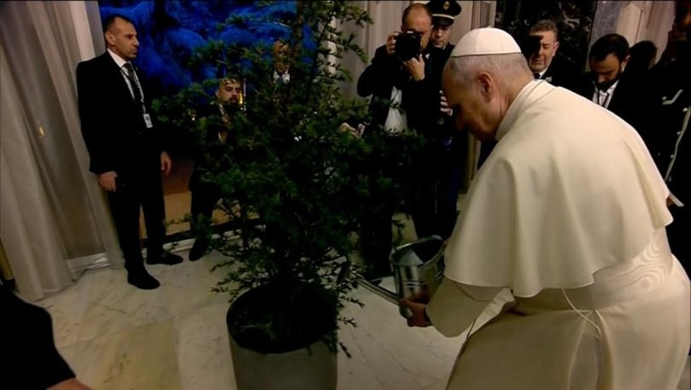 A scene shows Pope Leo XIV planting a cedar tree at Baabda Palace.