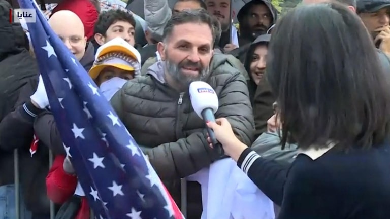 A large number of believers are taking part in welcoming Pope Leo XIV around the Mar Maroun Monastery in Annaya, and the MTV camera spotted one of them holding an American flag.