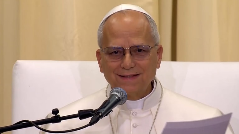 Pope Leo XIV addresses those welcoming him at the Hospital of the Cross in Arabic, saying: "Thank you… God be with you."