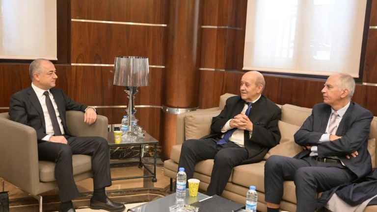 Deputy Speaker of Parliament Elias Bou Saab received French Presidential Envoy Jean-Yves Le Drian at the Parliament, accompanied by French Ambassador to Lebanon Hervé Magro and an accompanying delegation.