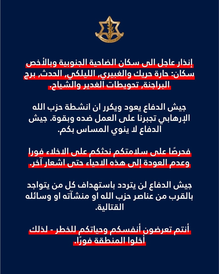 Israeli forces: We once again warn all residents in Dahiyeh to leave the area at once