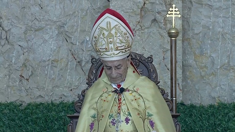 Maronite Patriarch Mar Bechara Boutros Rahi cries during his Easter sermon in Bkerke, saying: “We know your efforts, Mr. President, day and night, to stop the war and your efforts with friendly countries, and we believe with you that the risen Christ will raise Lebanon from a state of death to life.”