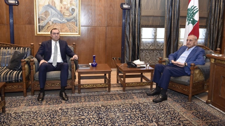 Parliament Speaker Nabih Berri received Army Intelligence Director Tony Kahwaji in Ain el-Tineh, with talks focusing on the latest field developments and the overall security situation. Berri also met Father Elias Chtoui and Father Wadih Naameh, discussing general and national affairs.