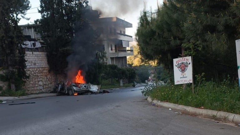 Photo: A car has been targeted on the main road between Shoukin and Nabatieh