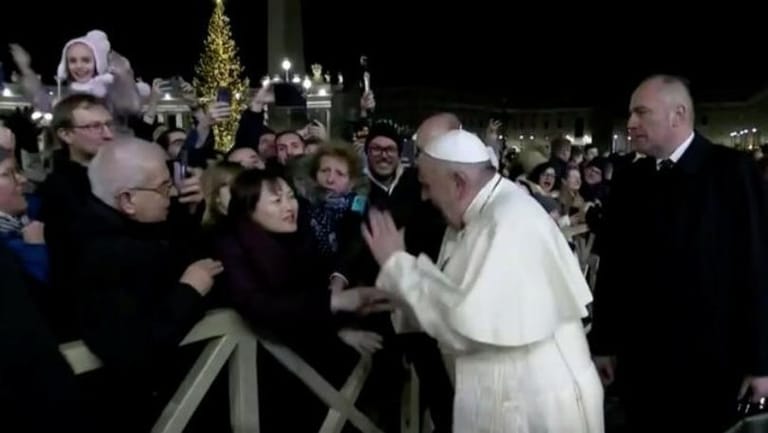 When the Pontiff was making his way to visit the Nativity Scene in Saint Peter's Square, in Vatican City a woman suddenly grabbed the pope's arm and pulled him to her side in a seemingly aggressive way prompting a swift pair of slaps.
