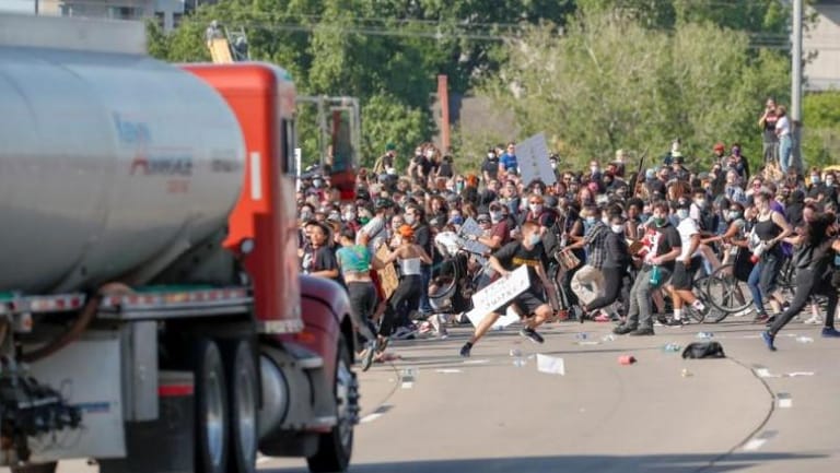 A tanker truck drove through thousands of people marching on a Minneapolis highway to protest the death of George Floyd on Sunday before protesters dragged the driver from the cab and beat him, according to a Reuters witness and authorities.