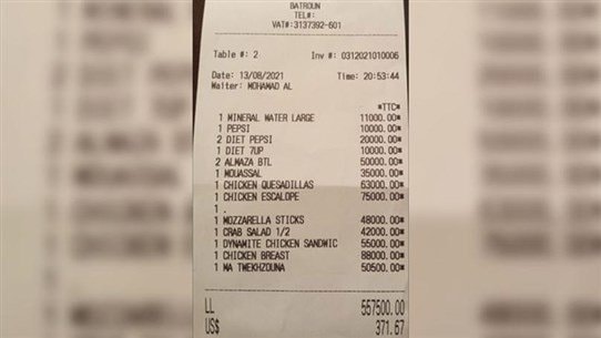 A picture circulated on social media of a restaurant bill in Batroun, at the end of which is written, “Excuse us”, with a price of LBP 50,500 next to it.