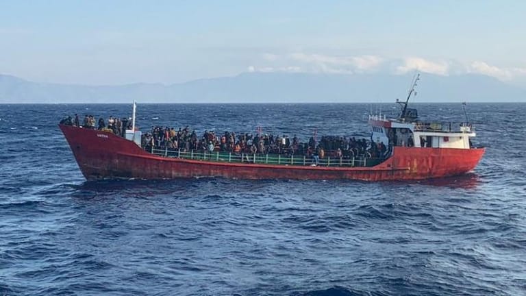 Six people among what was the country's biggest single influx of migrants in years were detained after the vessel, the Murat 729, was towed into Kos port by a Greek coast guard ship, the migration ministry said.