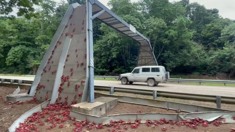 Photos and video shared by Parks Australia show thousands upon thousands of crabs scurrying across roads and specially-constructed bridges.