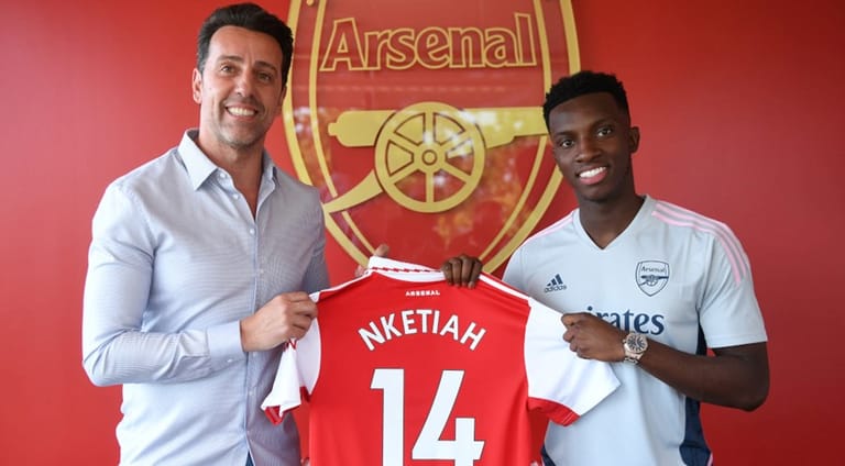 Young striker Eddie Nketiah will wear Arsenal's iconic number 14 shirt next season after signing a long-term contract, the Premier League club said on Saturday.