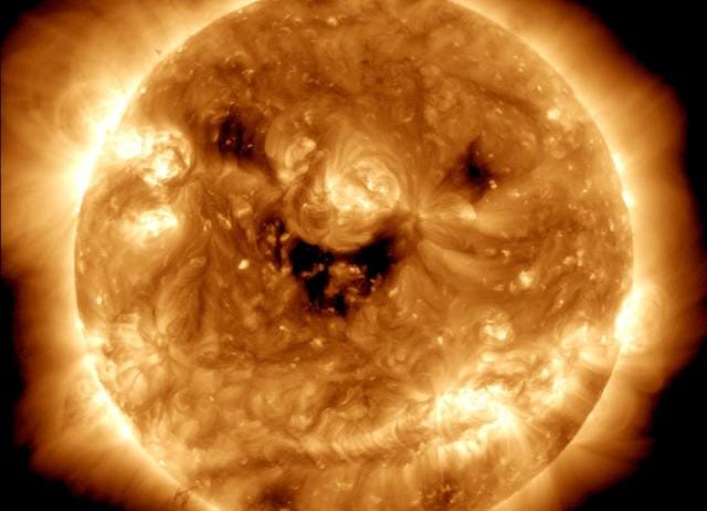 The smile is not as friendly as it appears: the dark patches that make up the figure are coronal holes that allow solar wind to escape from the Sun. That wind could trigger a solar storm on Earth, forecasts suggest, though it is expected to be relatively minor.