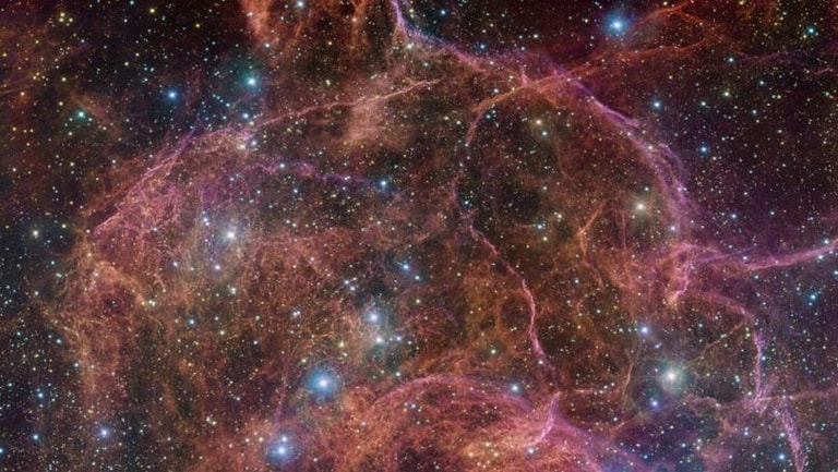 The wispy structure of pink and orange clouds is all that remains of a massive star that ended its life in a powerful explosion around 11,000 years ago. When the most massive stars reach the end of their life, they often go out with a bang, in an outburst called a supernova. These explosions cause shock waves that move through the surrounding gas, compressing it and creating intricate thread-like structures. The energy released heats the gaseous tendrils, making them shine brightly.