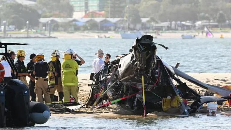 Images from the site show debris strewn around the area and a mangled helicopter apparently lying upside down opposite the Sea World resort.