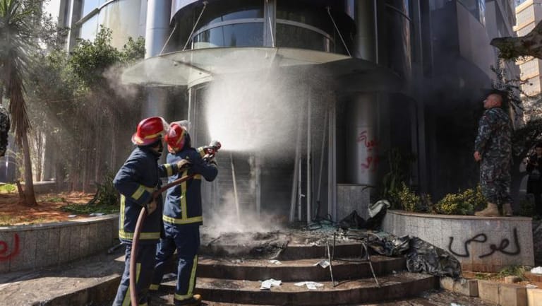 A bank in the Badaro neighbourhood smouldered as firefighters sprayed water, while riot police stood nearby with shields.