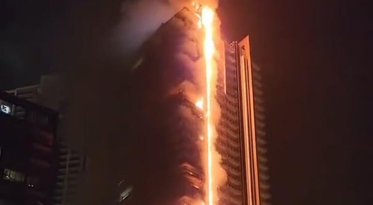 The Dubai Civil Defense statement, cited by The National, described the fire as starting on the fourth floor. The char marks could be seen on the fifth floor, where glass appeared to have been blown out by the blaze.
