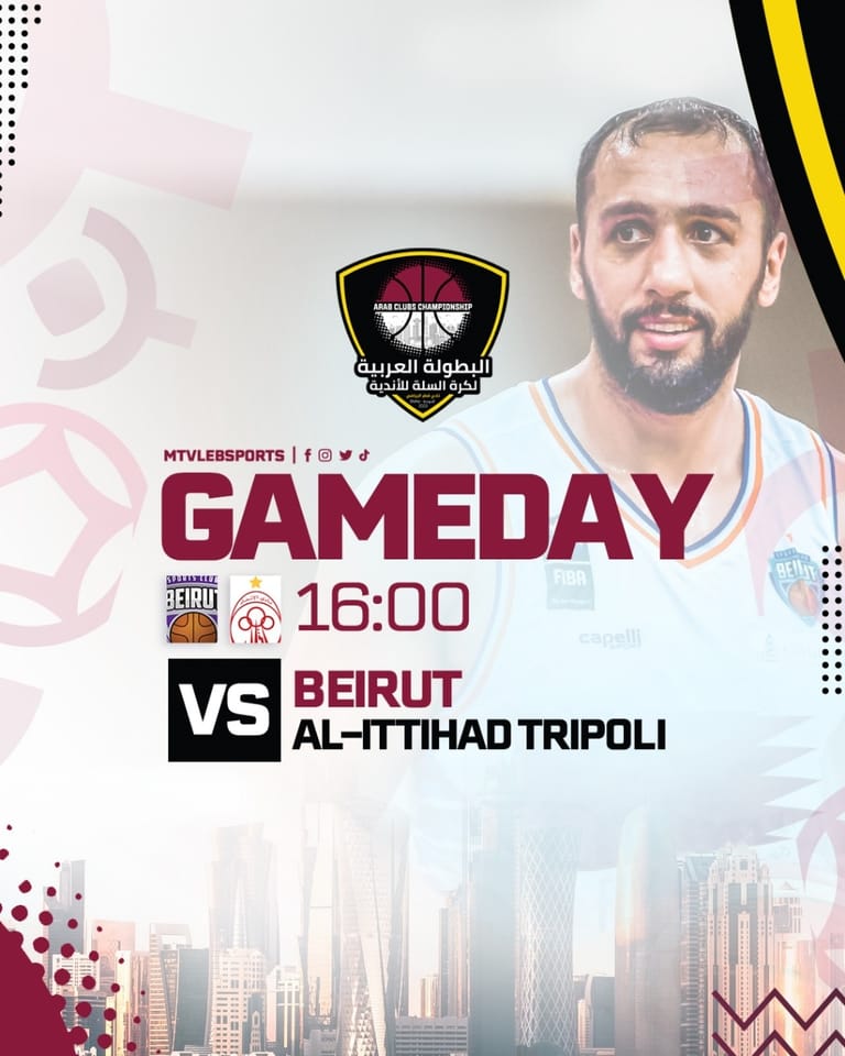 Stay tuned for the match between the Lebanese team Beirut and the Libyan team Al-Ittihad Tripoli, within the first round of the Arab Clubs Basketball Championship, at 4:00 pm, live on MTV