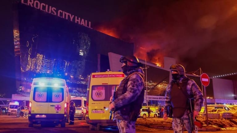 The video shows several armed men armed with assault rifles and knives at the lobby of the Crocus City Hall concert venue in Krasnogorsk, northwest of the Russian capital.