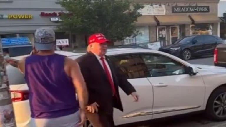 The man appeared with a bandage on his right ear, the same ear that was injured by a bullet when he survived an assassination attempt at an election rally in Pennsylvania. The man, who was dressed in a suit and a red hat similar to the ones Trump wears, greeted several of his supporters in Long Beach, New York, and entered a bar where someone asked him, "How's your ear?" He responded in a voice similar to Trump's, saying, "It's doing great."