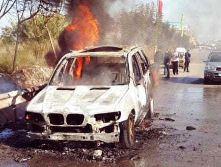 A black BMW car reported stolen by owner Charbel Sfeir was found wrapped in flames on Jbeil's Bekhaaz road