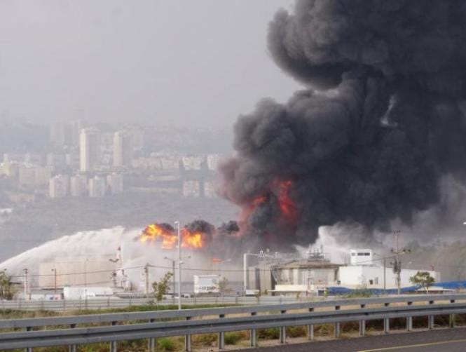 "We have a fuel tank on fire. The level of the fuel in it is relatively low, about a metre (three feet) high," Uri Chibotero, a Haifa Fire Brigade spokesman, said on Israel Radio.
