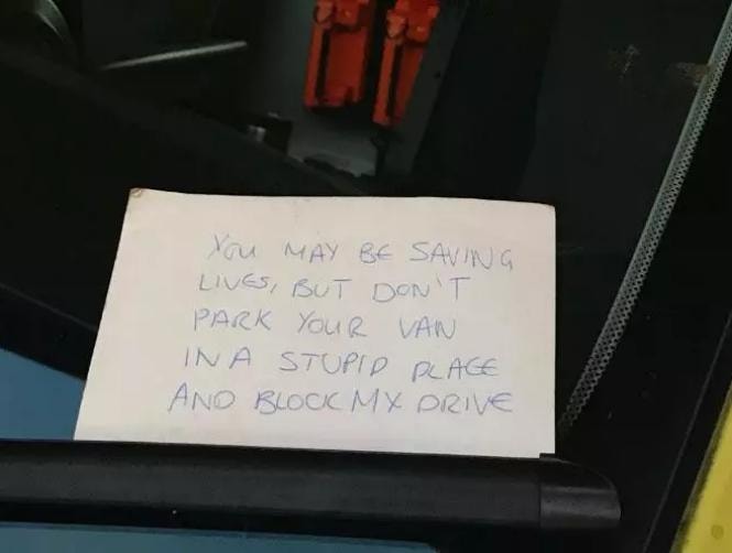Casually placing a note under the window wiper of the ambulance, the individual claimed they had parked the van "in a stupid place" which was blocking their drive.