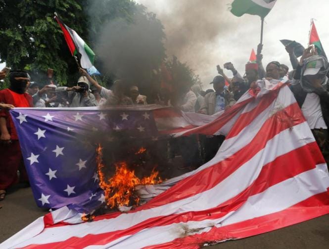 Hardline Muslim groups in Indonesia burned photos of U.S. President Donald Trump, as well as U.S. and Israeli flags, on Monday during a protest outside the U.S. embassy against Trump's decision to recognize Jerusalem as the capital of Israel.