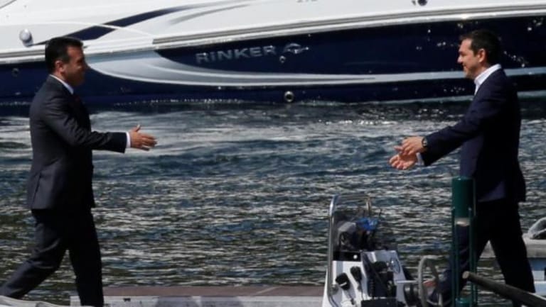 Zaev arrived by speedboat, received by Tsipras on the Greek side of the lake, where they warmly embraced.