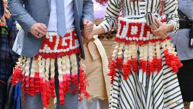 The red and white skirts, which the two wore over their normal clothes, spelled “TONGA” in flowers at the waist and won over excited crowds in the archipelago nation, and further afield.