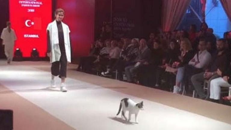 A sassy feline took to the runway at a fashion show in Turkey, strutting its stuff on the ‘catwalk,’ playing with a model’s clothes and casually licking itself in front of “shocked” fashionistas sitting in the front row.