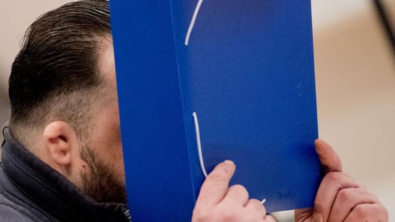 Hoegel hid his face behind a blue plastic folder as he was ushered into the courtroom in the northern city of Oldenburg by police and his attorney.