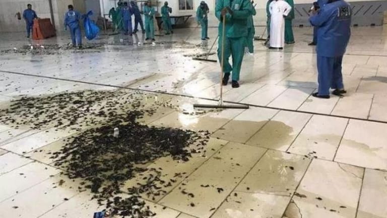 The holiest site in Islam has been hit by a plague of locusts, forcing cleaners into action to drive the insects out.
