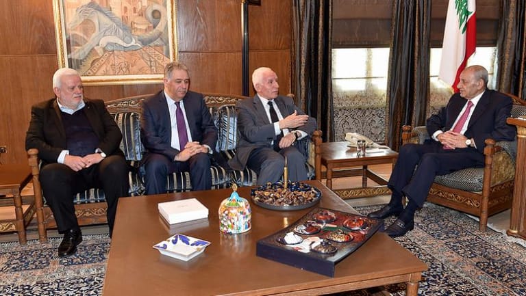 Parliament Speaker Nabih Berri met Thursday afternoon in Ain al-Tineh with member of the Fatah Central Committee Azzam Al-Ahmad, the Ambassador of Palestine to Lebanon Ashraf Dabour, and the secretary of Fatah and the PLO factions in Lebanon Fathi Abu al-Urdat, with talks touching on the latest developments on the Arab and Palestinian arenas.