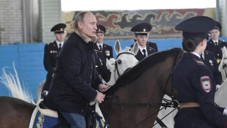 President Vladimir Putin mounted a horse on Thursday and cantered with female police officers in footage broadcast across Russia ahead of International Women’s Day.