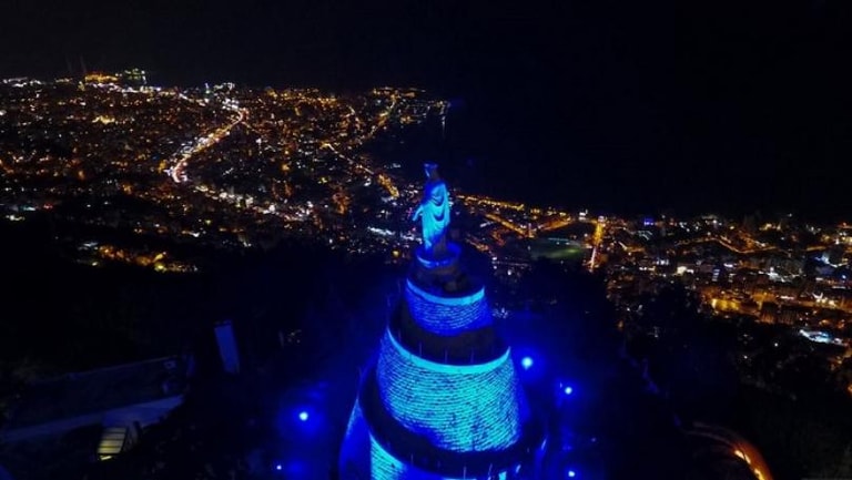 Lady of Lebanon Harissa lit up in blue on World Autism Day