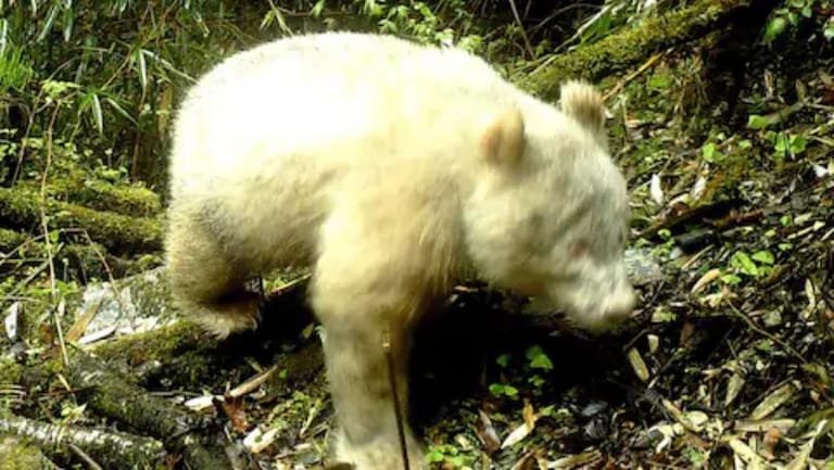 The Wolong national nature reserve in the south-western province of Sichuan released a photo taken in April of an all-white giant panda in the wild, crossing through a forest.